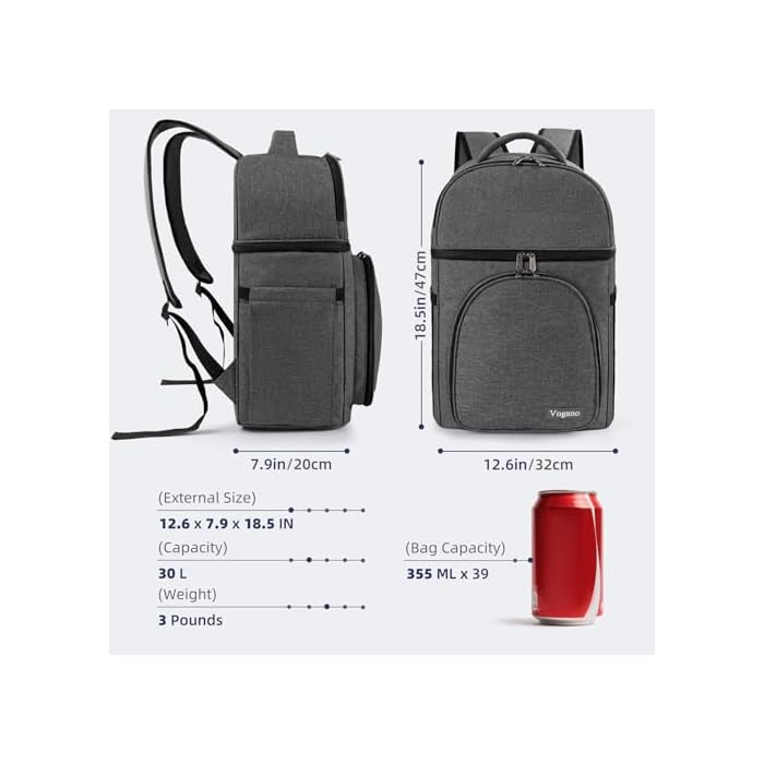 Dual-Layer Design: This leak-proof picnic backpack features a dry storage compartment at the top for dry food, and a refrigerated compartment at the bottom for cold drinks with ice, capable of holding up to 25 cans of cola. It has ample space for storing beer, juice, sandwiches, or other cold foods. Two large elastic side pockets are ideal for holding a bottle of wine and a picnic blanket.