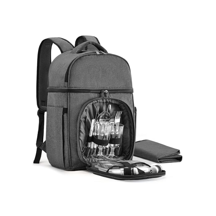 Picnic Backpack & Accessories: This picnic set includes 2 stainless steel knives, forks, spoons, plates, cotton napkins, wine glasses, 1 cheese/butter knife, 1 bottle opener, 2 salt/pepper shakers, and 1 plastic cutting board + waterproof portable picnic mat.