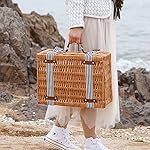 CLASSIC SUITCASE DESIGN: The picnic basket is well constructed & lightweight. It is made of strong & long-lasting natural wickers with 2pcs unique navy blue straps all over the basket. and it features thick inner lining, sturdy leather straps and buckles. Great for a romantic picnic outing at the beach, park or backyard.