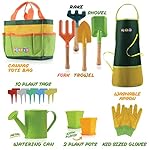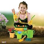 SET INCLUDES – This 12-piece kid gardening set includes a shovel, trowel, fork, rake, watering can, gardening gloves, plastic seed labels, 2 buckets, gardening apron, and canvas tote.