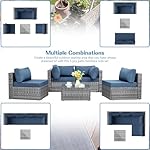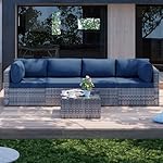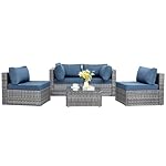 Shintenchi 5 Pieces Outdoor Patio Sectional Sofa Couch, Silver Gray PE Wicker Furniture Conversation Sets with Washable Cushions & Glass Coffee Table for Garden, Poolside, Backyard (Aegean Blue)