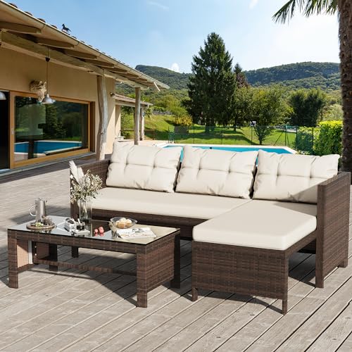 Sturdy&Durable: Solid metal structure make it super safe to sit in the sofa set. Added bars for the frame enhance the sturdiness and allow the sofa to support heavy people about 400lbs. Adjustable feet make it steady on uneven surfaces. PE Wicker is strong enough to survive inclement weather and guarantee the set has a long service life.Note: cushions are not water-proof, When you don’ t use it, advise you to take cushions inside or buy a cover for longer service time.