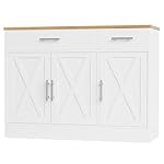 Large Storage Space Cabinet: The buffet cabinet incorporates both open and closed storage space to meet your different needs. Spacious tabletop can place items for easy access, three handy drawers help classify knives and forks neatly, while two bottom cabinets each with internal shelf offer smart space to accommodate mugs, extra dishware, and other essentials.