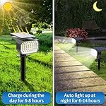 3 BRIGHTNESS LIGHTING MODES: Solar spot lights outdoor have 3 lighting modes to meet your different needs.Simply press the power button to make a choice modes between Low Light Mode/Medium Light Mode/High-Light Mode, whose working time is 16, 11, and 6 hours at maximum. The solar landscape lights can sense the surrounding brightness, automatically light up at night and get charged in the daytime. For long-term lighting, it’s suggested to make a choice low light and medium light mode