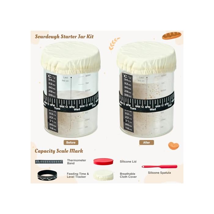 【34oz Starter Jar Kit】: The sourdough starter jar kit includes a silicone cover that doubles as a fridge storage lid and a non-slip counter base all the way through fermentation with the cloth cover, complete with volume, net weight, and feed line marks, a thermometer, cloth cover, spatula, and an elastic band marked with days of the week for as it should be tracking feeding dates and levels. The wide-mouth design makes it easy to add flour and water, in addition to to get right of entry to and take away your starter whenever needed.