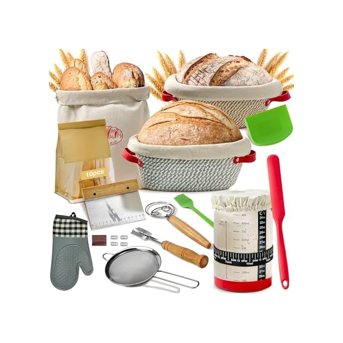 【33 Pcs Sourdough Starter Kit Include】: Round Proofing Basket (9 Inch) X 1, Oval Proofing Basket (10 Inch) X 1, 34 oz Sourdough Starter Jar X 1, Silicone Spatula X 1, Dough Whisk X 1, Bread Lame X 1, Blade X 5, Blade Cover X 1, Bowl Scraper X 1, Stainless Steel Scraper X 1, Stainless Steel Filter X 1, Cooking Brush X 1, Bread Bag X 10, Reusable Bread Bag X 1, Silicone Glove X 1.