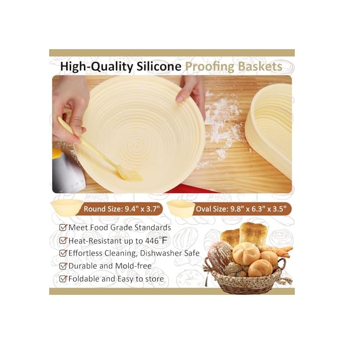 🍞【DURABLE BREAD PROOFING BASKETS 】:9″ Round and 10″ Oval Proofing Baskets are made of BPA-Free food grade silicone which can withstand temperatures up to 446°F. Compare to easy-mold rattan bannetons, TeeMars bread proofing baskets are smooth, no splinter and never to mold, safer for your family. Even more surprising is that it’s foldable, easy to store and clean. Before putting the dough into silicone basket, please sprinkle a thin layer of flour on the basket to make sure less sticking issues.