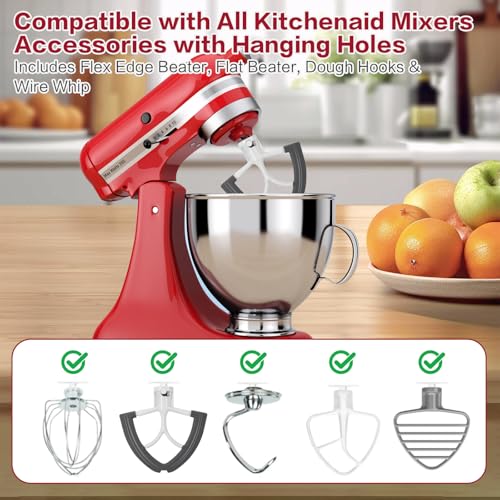 Compatibility: universal design for mixer attachment organizer compatible with a wide variety of kitchen aid mixers accessories with hanging holes, includes Flex Edge Beater, Flat Beater, Dough Hooks and Wire Whi