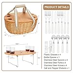 Patented Large Picnic Basket:Picnic hamper set is measured by 17″ X 13″ X 8″ and 16.9″ X 13″ X 6.2″ wine table,Including 4 X Stainless steel tableware service set(knife, fork and spoon), 4 X plastic wine glasses, 1 X waiter style bottle opener, 2 salt & pepper shakers