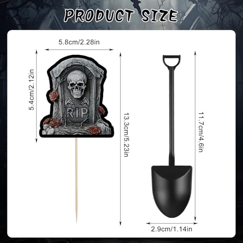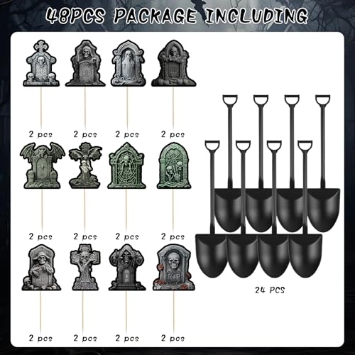 Value Included – You will get 24 pieces of tombstone cupcake toppers in 12 different designs and 24 mini black spoon shovels in bulk, cake toppers are pre-assembled, can use it directly. Spoon packaged separately. Totally 48 pieces.