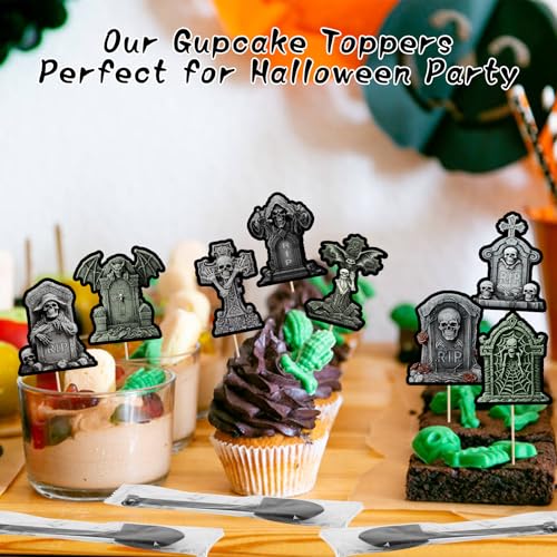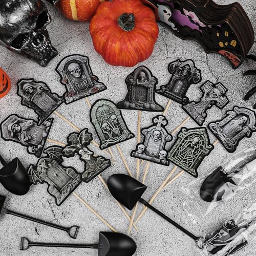 STEFORD 48 PCS Halloween Cupcake Toppers, Tombstones Cake Decorations Graveyard Cupcake Picks with Novelty Mini Shovel Spoons for Baking Food Décor Birthday Cake Decoration Party Supplies