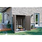 VERTICAL OUTDOOR STORAGE: A thoughtfully designed vertical storage shed ideal for organizing garden tools, outside equipment, and other backyard necessities, keeping them stored and safe from the elements