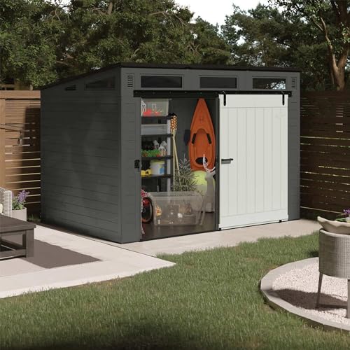 Suncast Modernist 10 Foot by 7 Foot Outdoor Plastic Storage Shed with Pad Lockable Sliding Barn Door for Outdoor Storage Items, Gray and Black