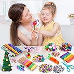 Art Craft Supplies Set: DIY Jewelry Making Crafts Materials for Kids 6-10 – Includes Storage Bag, fuzzy sticks, craft sticks, pom poms, felt pieces, craft papers, star shapes, feathers, sequins, sheet of gemstone stickers, googly eyes, acrylic crafts guka sheet, chain, sheets oflaser stickers, beads, letter beads, craft stick, colorful craft sticks, wooden clips, Safetu Scissors, elastic thread, tweezers, nano stickers, skeins embroidery floss,