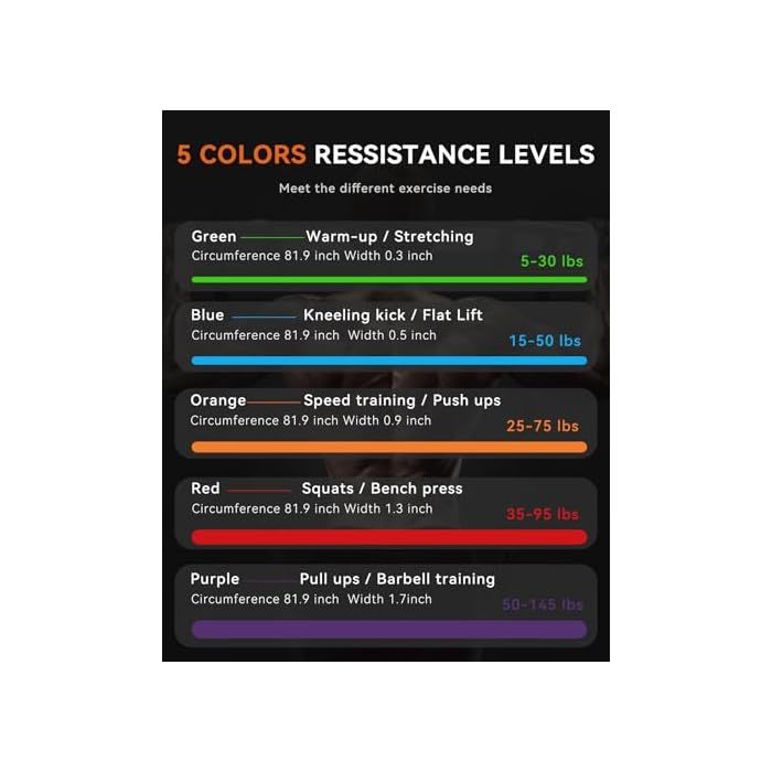 Specifications: Green(5-30 lbs), Best for speed barbell training and shoulder mobility. Blue(15-50 lbs), Prefect beginning bands for resistance training. Orange(25-75 lbs), Medium tension for resistance training and pull up assist. Red(35-95 lbs), Ideal for pull up assist, High tension for resistance and advanced banded barbell training. Purple(50-145 lbs), Ideal for pull up assist training,Powerlifting andstretching.