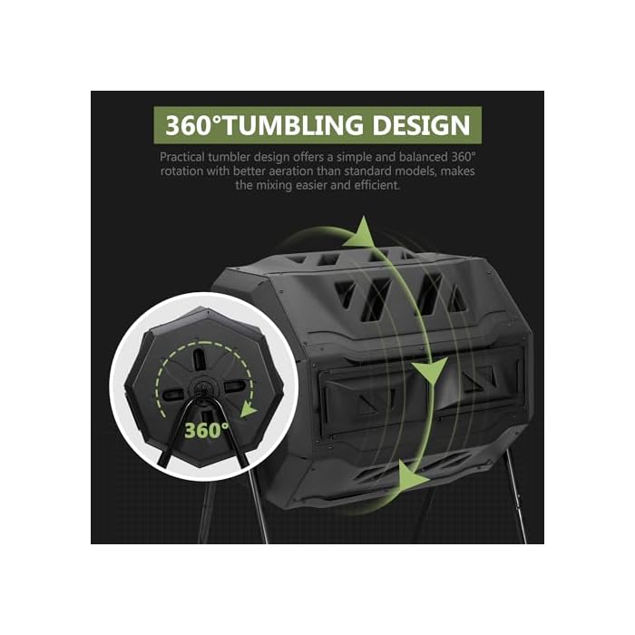 『More Efficient 2 Champers Design』Dual composter chambers permit you to compost incessantly to create a simple yet more efficient cyclic process with better quality results. Much easier to get leads to 2-4 weeks by turning 5-6 times each and every couple of days, and use 2 separated areas to create a healthy process-cycle.
