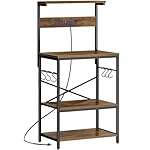 SUPERJARE Kitchen Bakers Rack with Power Outlet, Coffee Bar Table 4 Tiers, Kitchen Microwave Stand with 6 S-shaped Hooks, Storage Shelf Rack for Spices, Pots and Pans – Rustic Brown