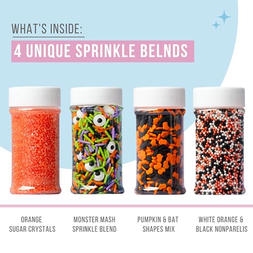 Sweets Indeed Halloween Sprinkles 4-Pack – 10.90 oz Jar Set | Candy Eyeball Mix, Bat & Pumpkin Quin Mix, Orange Sanding Sugar & Black/White/Orange Nonpareils | Cupcake & Cookie Decorations