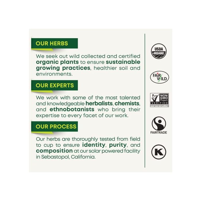 USDA Certified Organic, Non-GMO Verified, Kosher, Caffeine Free, Compostable Tea Baggage, Herbalist-formulated