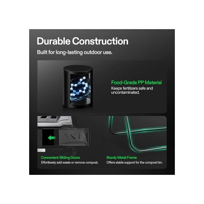 Sturdy & Durable Construction: Constructed of premium metal frame and high-quality pp plastic body, this tumbling composter is corrosion-resistant, weathering-resistant, sturdy, and durable for long-lasting service life