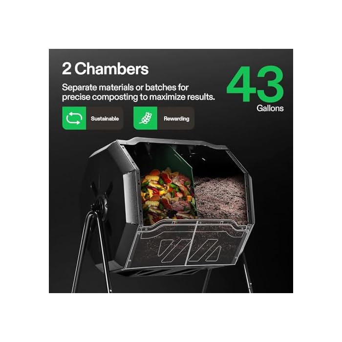 Twin chambers: Two separate chambers allow one side to finish composting while leaving the other side available to add fresh wastes; Constant alternation of the two sides will create an uninterrupted stream of nutritious compost