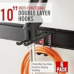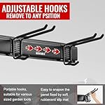 DURABLE RAILS & RUBBER-COATED HOOKS: This garden tool organizer has 6 hooks, each and every 10 inches long. The hooks are wrapped in rubber to offer protection to your tools from sliding and getting damaged. Rubber-coated sleeves prevent your tools from getting scratched or slipping.