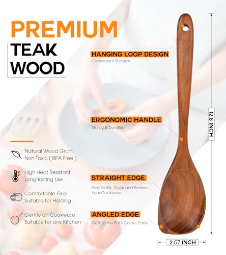 Wooden Spoons for Cooking, Natural Premium Teak Wood Corner Spoon, Good Grip Large Wooden Spoons and Wooden Spatula, Heat Resistant Wooden Cooking Utensils for Nonstick Cookware Cooking Gifts
