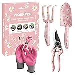 WORKPRO Aluminum Garden Tool Set, 4PCS Heavy Duty Gardening Tools with Box Include Trowel, Rake, Pruner, Gloves, Pink, Garden Gifts-Pink Ribbon