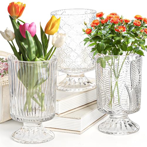 3 Pack Flower Vases for Centerpieces, Vintage Glass Pedestal Vase Set, Decorative Embossed Big Base Vase, Clear Hurricane Candle Holder, Medium Cylinder Vase for Wedding, Home, Party, Office
